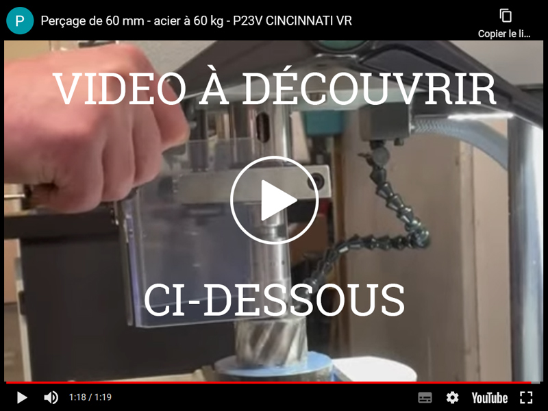 Perceuse à colonne ou perceuse établi, nous vous invitons à suivre cette vidéo montrant la réalisation d'un perçage de 60 mm dans un acier à 60 kg, sur une profondeur de 16 mm !